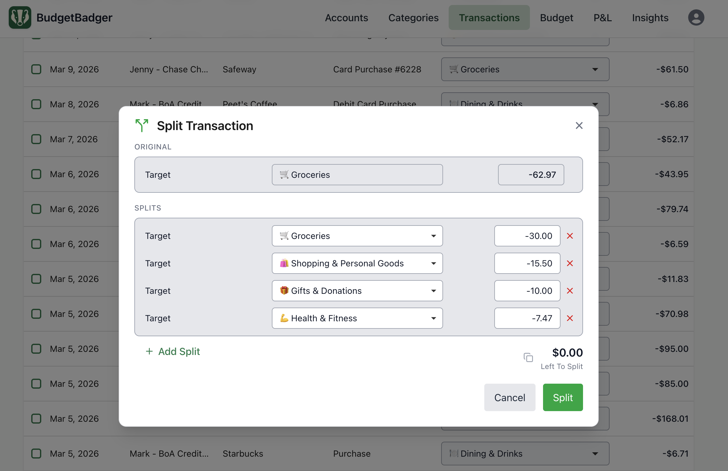 Splits matter most when a single bank line mixes different kinds of spending or reimbursable money across people. The examples below happen every day - splitting enables you to keep your budget honest.